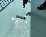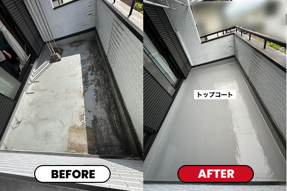雨漏りしている室内の真上にベランダがあり、排水口の詰まりで雨水が約10cmも溜まっていました。FRP防水層の劣化もあったため、ウレタン防水工事による補修を実施しました。