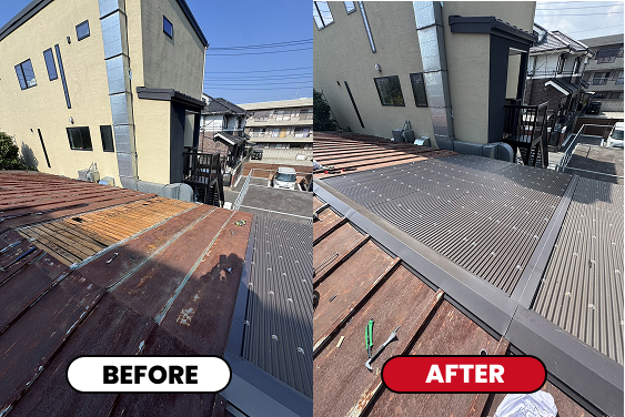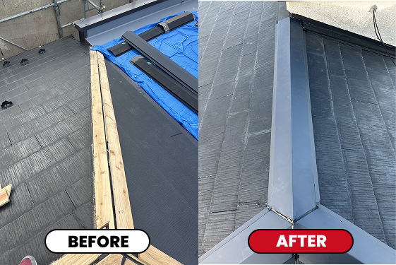 雨漏り箇所の酷い部分だけを修理希望との事でしたので、範囲を限定し修理を行いました。雨漏りの原因となっている屋根の一部のみをピンポイントで張り替える対応を実施しました。